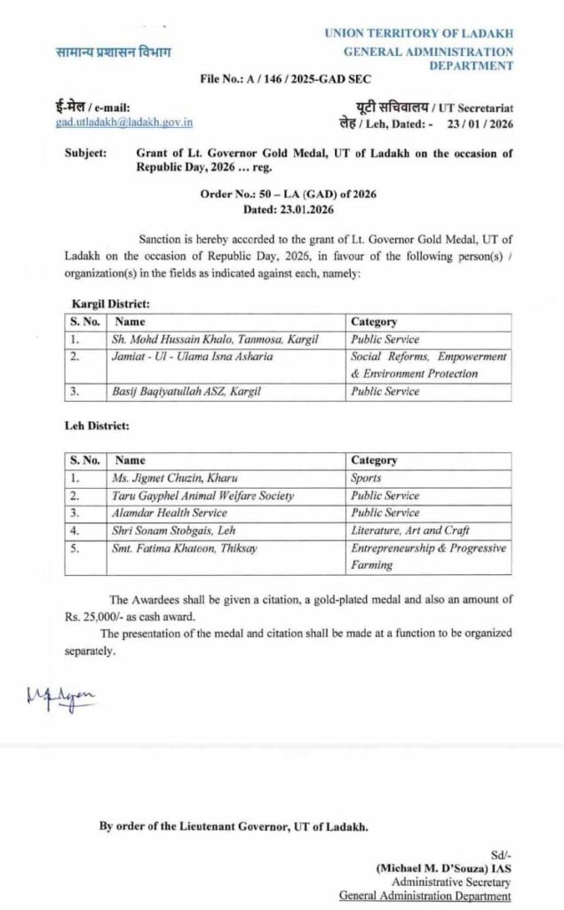 Leh, Jan 23: The Union Territory Administration of Ladakh has approved the conferment of the Lt Governor’s Gold Medal on 8 individuals and organisations from Kargil and Leh districts on the occasion of Republic Day 2026.