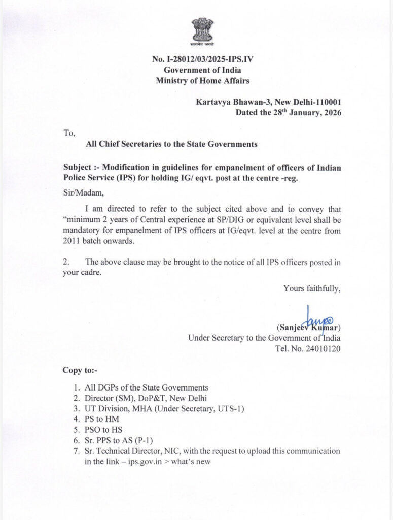 New Delhi, Jan 31: The government has made it mandatory for IPS officers of the 2011 batch and onwards to have a minimum of two years’ experience at the SP or DIG level on central deputation to be empanelled as inspector general (IG) at the Centre, an official order said.