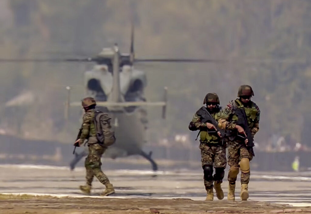 The indigenous Advanced Light Helicopters (ALH) demonstrated Special Heli-Borne Operations (SHBO) by dropping off commandos at the airstrip.