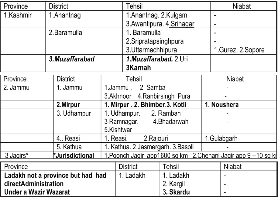 A fair and honest trial could be done by looking at the structure of Civil Administration given to J&K by the times of Maharaja Hari Singh before when the then Princely state of J&K acceded to India Dominion on 26th Oct 1947 to become part of India i.e Bharat Democratic Republic. Civil Divisions / Administration For the purposes of civil administration, the state was divided into three parts ; 1. Province of Jammu [ app 14010 sq Miles(12401+1600+9) /36315 Sq Km } 2. Province of Kashmir { 8569 sq miles / 22133sq Km} 3. District of Ladakh. The head of revenue administration in each province was a Governor.. Ladakh district was under a Wazir Wazarat. Kashmir Province: { 8569 sq miles / 22000sq Km} : The Geographical Division of J&K comprising of the Jhelum valley (consisting of the valleys that drained into the Jhelum and Krishan Ganga rivers ) and the lateral valleys of the Sind as well as that of Liddar together form the famous Kashmir valley. Kashmir Valley along with the hilly track of Muzaffarabad included in Kashmir Province. It is the Kashmir Region of today.