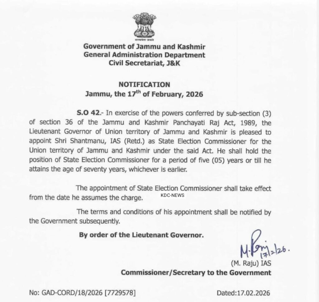 Jammu, Feb 17: The Jammu and Kashmir Lieutenant Governor Manoj Sinha on Tuesday appointed Shantmanu, IAS (Retd.), as the State Election Commissioner for the Union Territory of J&K.