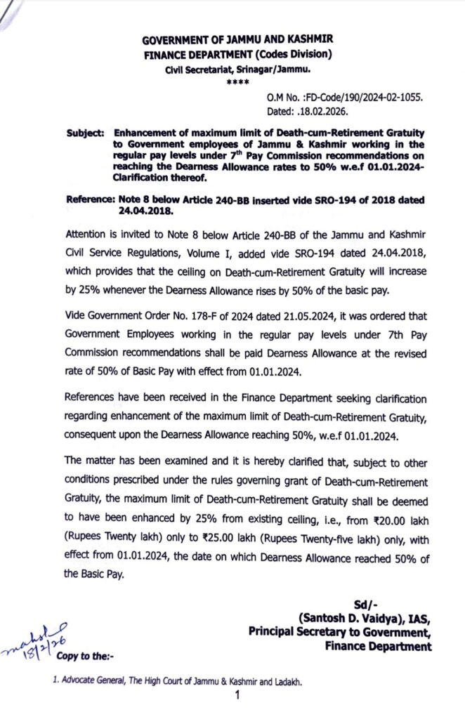 JAMMU, Feb 18: The Jammu and Kashmir Government has clarified that the maximum limit of Death-cum-Retirement Gratuity (DCRG) for employees working in regular pay levels under the 7th Pay Commission has been enhanced from ₹20 lakh to ₹25 lakh, effective January 1, 2024, following the Dearness Allowance reaching 50% of basic pay.