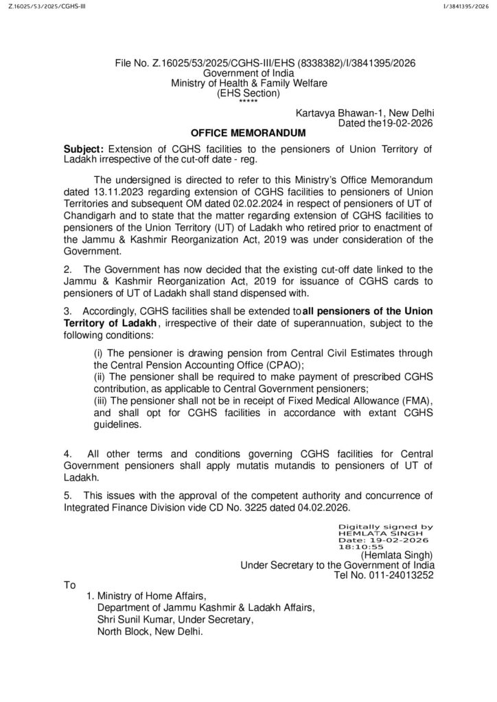 Leh, Feb 21: The Government of India has extended Central Government Health Scheme (CGHS) facilities to all pensioners of the Union Territory of Ladakh, removing the earlier cut-off date linked to the Jammu and Kashmir Reorganisation Act, 2019.