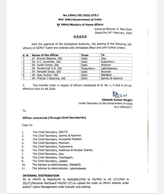 JAMMU, Feb 25: In a significant administrative development, the Ministry of Home Affairs has posted IAS officer Pranjal J Hazarika to the Union Territory of Jammu and Kashmir with immediate effect.