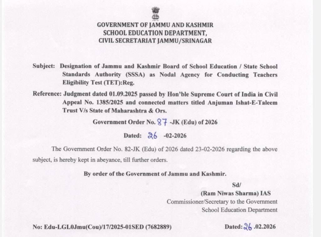 JAMMU, Feb 26: The Government of Jammu and Kashmir has kept in abeyance its earlier order regarding the designation of the Jammu and Kashmir Board of School Education (JKBOSE) / State School Standards Authority (SSSA) as the nodal agency for conducting the Teachers Eligibility Test (TET), officials said on Wednesday.