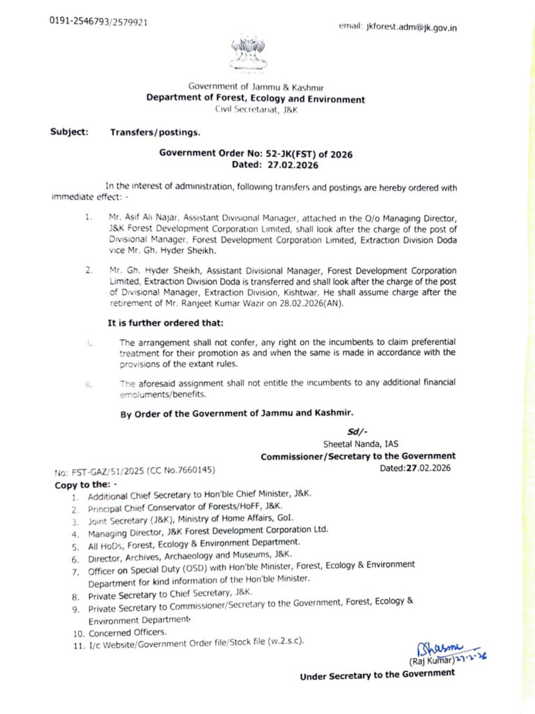 Jammu, Feb 27: The Department of Forest, Ecology and Environment has ordered transfers and postings in the Jammu and Kashmir Forest Development Corporation Limited (FDCL) with immediate effect.