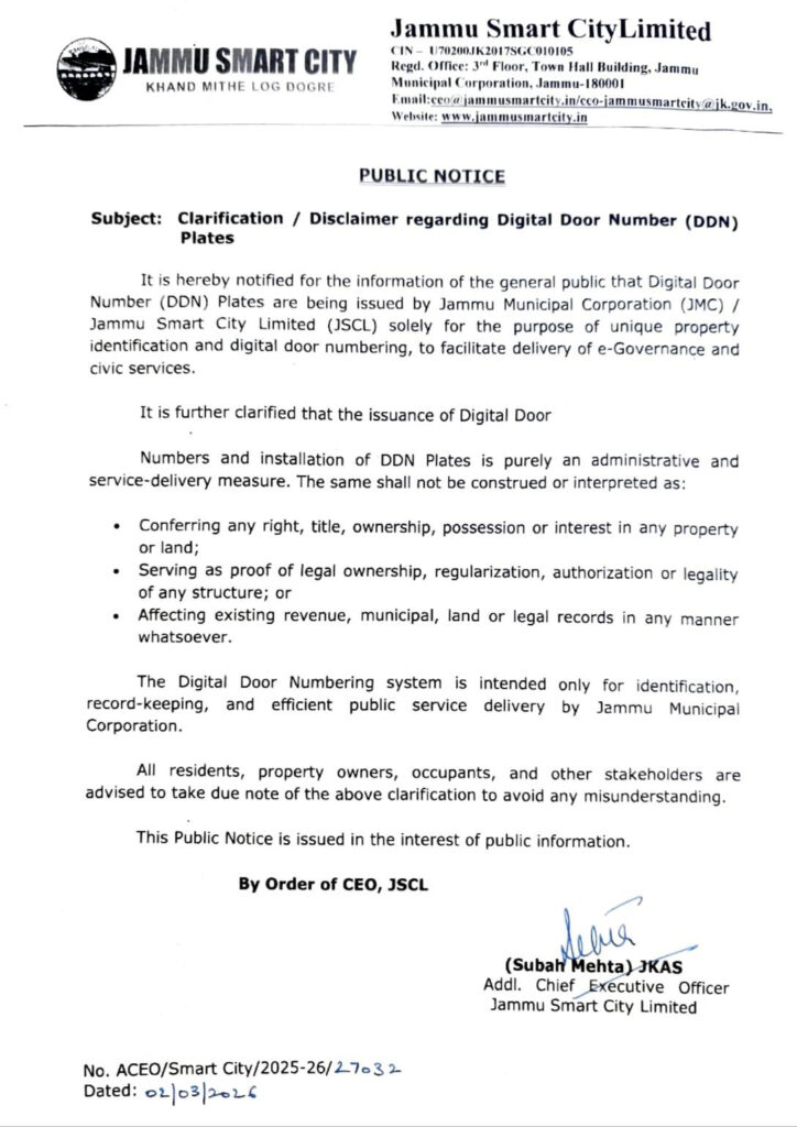 In a public notice issued by JSCL and Jammu Municipal Corporation (JMC), authorities stated that the digital door numbering system is purely an administrative and service-delivery measure aimed at improving record-keeping and public service delivery.