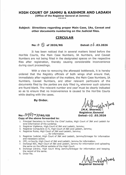 Jammu, Mar 9: The High Court of Jammu & Kashmir and Ladakh has issued directions to registry officials to ensure proper numbering of main case files, interlocutory applications (IAs), caveats and other related documents on judicial files to avoid inconvenience during court proceedings.