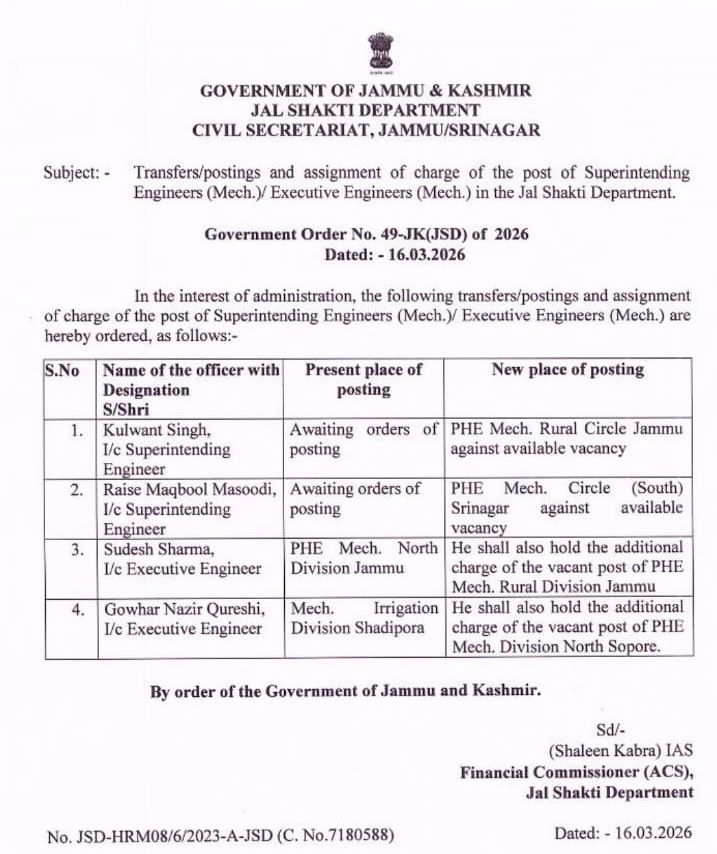JAMMU, Mar 16: The Jammu and Kashmir Government has ordered the transfer and posting of four engineers in the Jal Shakti Department.