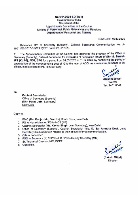 According to an order issued by the Department of Personnel and Training reads, The Appointments Committee of the Cabinet has approved the proposal of the Office of Secretary (Security), Cabinet Secretariat for extension of deputation tenure of Shri S. Suresh, IPS (KL:95), ADG, SPG for a period from 09.03.2026 to 31.12.2026.