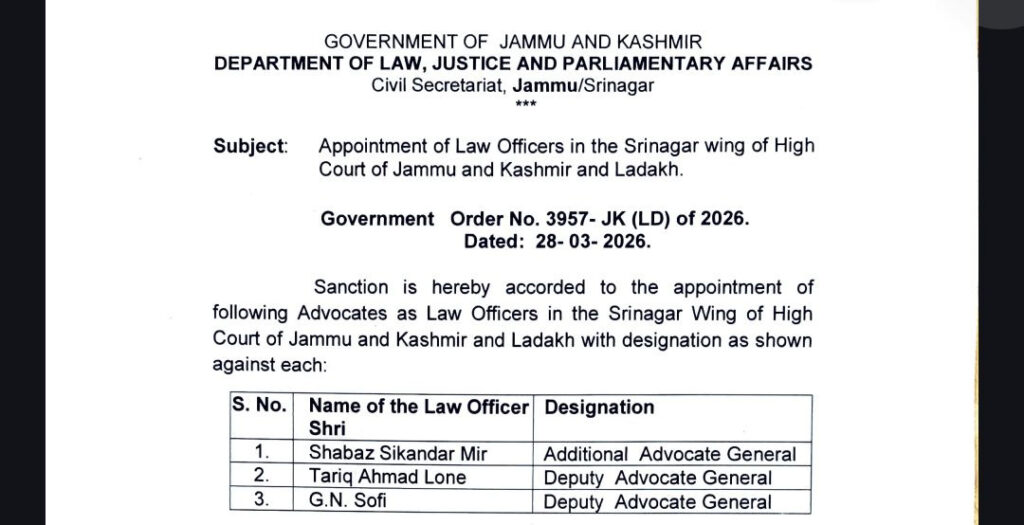 According to Government Order No. 3957-JK (LD) of 2026 dated March 28, Shabaz Sikandar Mir has been appointed as Additional Advocate General, while Tariq Ahmad Lone and GN Sofi have been appointed as Deputy Advocate Generals.