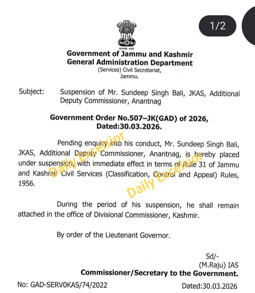 JAMMU, Mar 30: The Jammu and Kashmir Lieutenant Governor Manoj Sinha has placed Additional Deputy Commissioner Anantnag, Sundeep Singh Bali (JKAS), under suspension with immediate effect pending inquiry into his conduct.