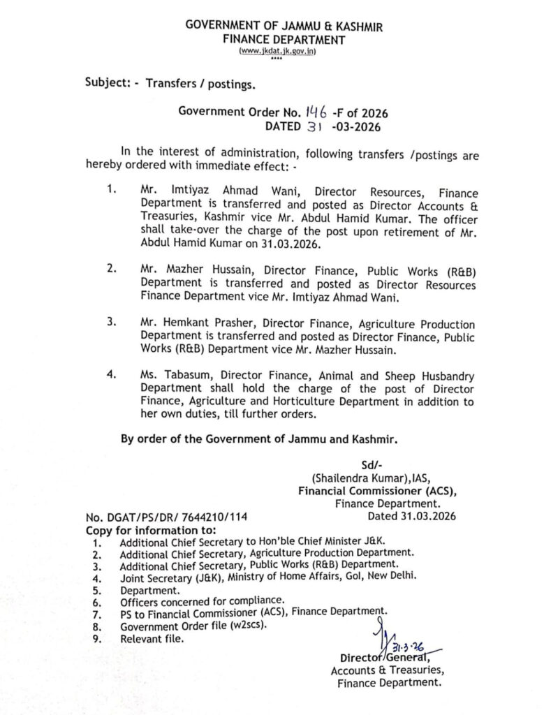JAMMU, Mar 31: The Finance Department of the Jammu and Kashmir Government has ordered the transfer and posting of 5 officers in the interest of the administration.