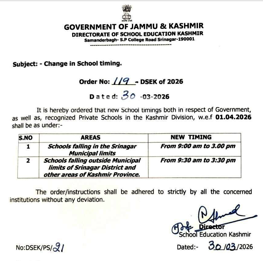 Srinagar, Mar 30: The Directorate of School Education Kashmir (DSEK) on Monday issued an order revising the schedule of school timings for all government and recognized private institutions across the Valley, with the new system set to take effect from April 1.